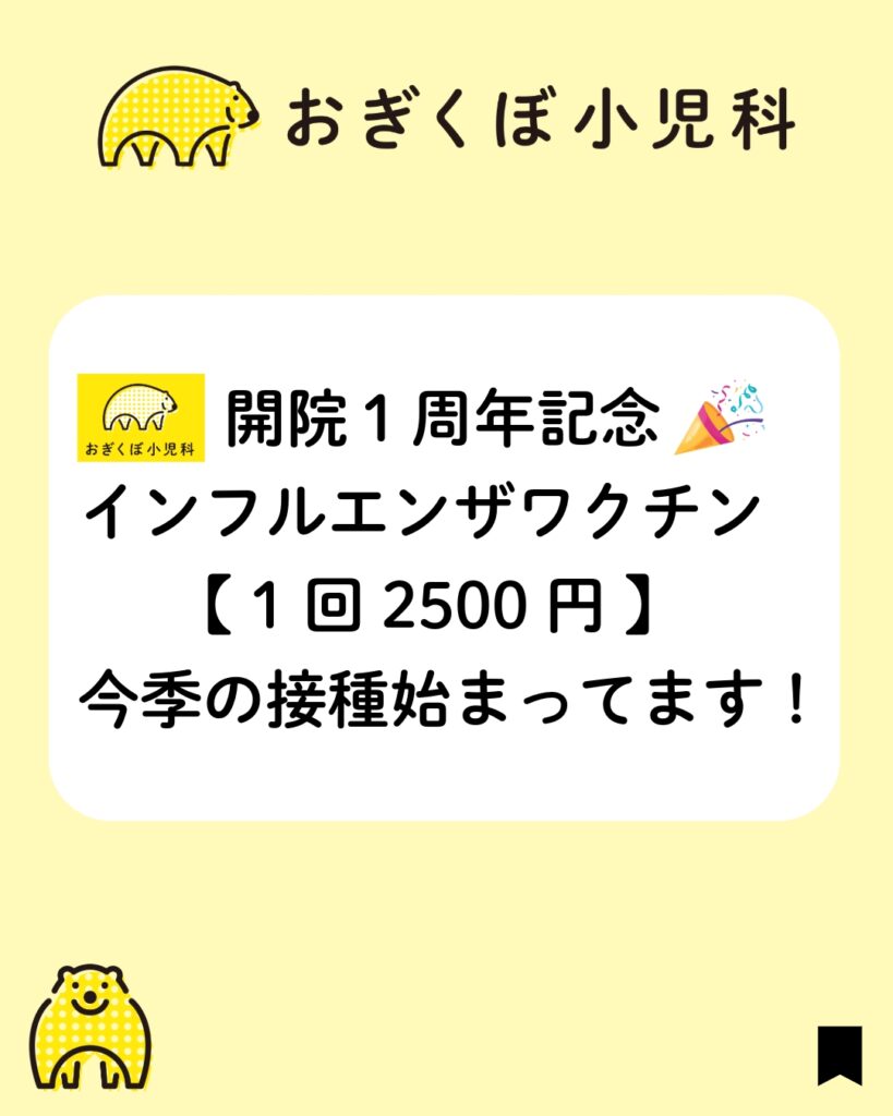 🎉【昨日から接種開始しました! 10月1日からインフルワクチン】 おぎくぼ小児科は10月1日で開院1周年を迎えます! そこで10月1日から今シーズンのインフルエンザワクチ… -