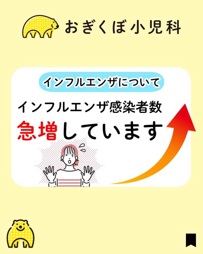 【インフル感染者急増中!!】 現在、都内・近隣地域でインフルエンザの報告数が上昇しています。 外来でも例年より早いタイミングで増加が見られ、乳幼児の発熱例が特… -