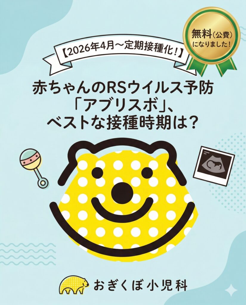 【RSウイルスから赤ちゃんを守る!話題のワクチン「アブリスボ」対象者は?💉🤰】 こんにちは!おぎくぼ小児科です🐻✨ いよいよ今月、2026年4月からRSウイルス定期ワクチン… -