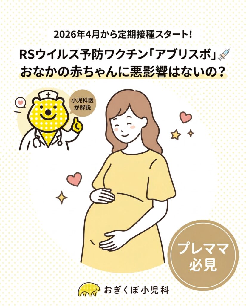 【RSウイルスから赤ちゃんを守る!話題のワクチン「アブリスボ」対象者は?💉🤰】 こんにちは!おぎくぼ小児科です🐻✨ いよいよ今月、2026年4月からRSウイルス定期ワクチン…