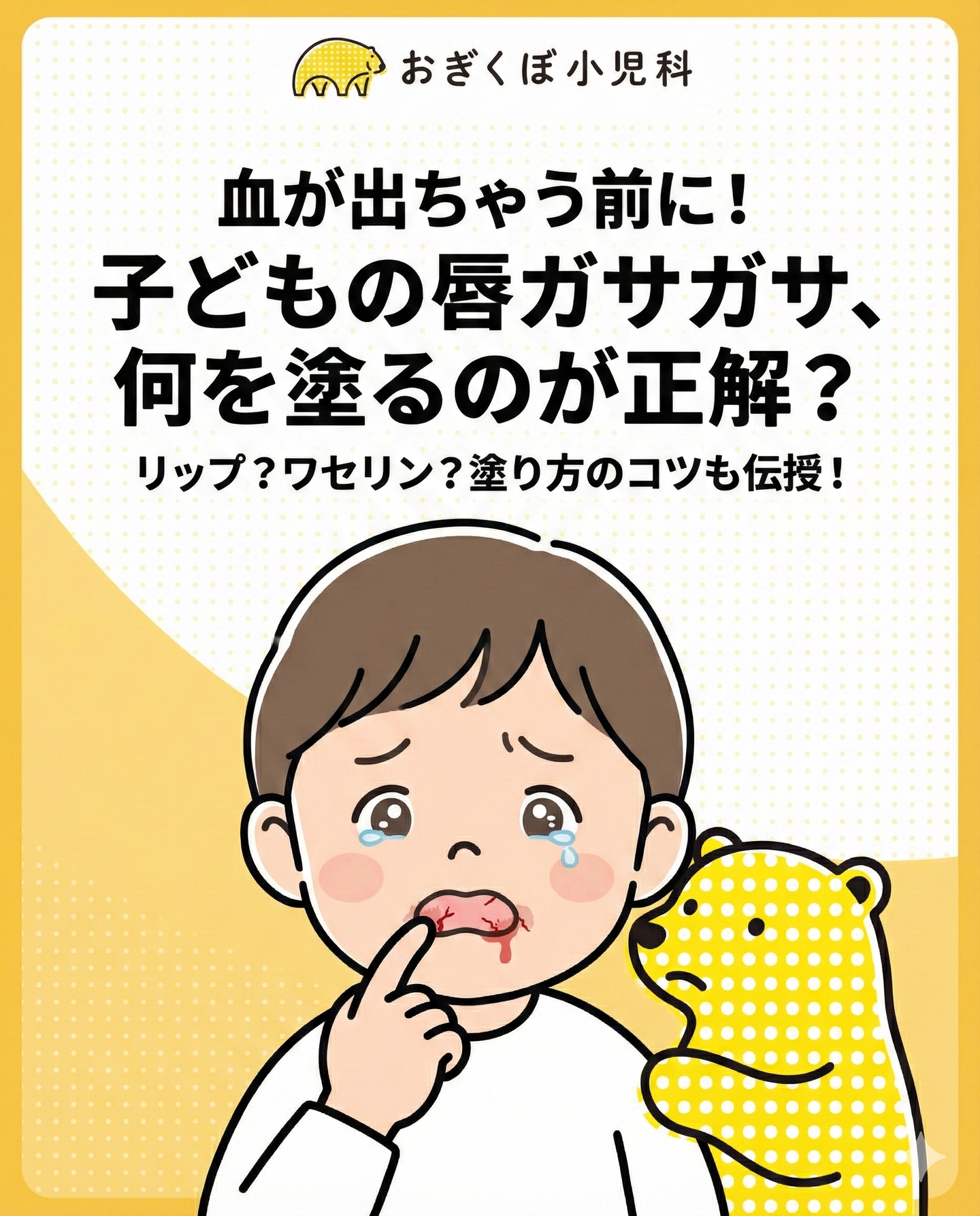 冬になると急増する 「子どもの唇が切れて血が出ている…」 「リップを塗っても全然治らない」 というご相談💦