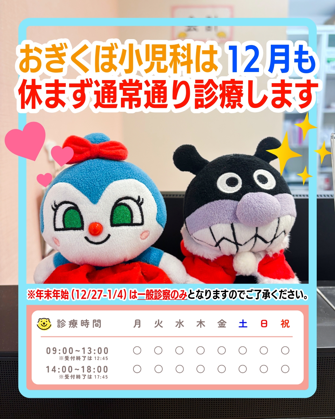 おぎくぼ小児科は12月も休まず、通常通りの診察時間で診察を行います。