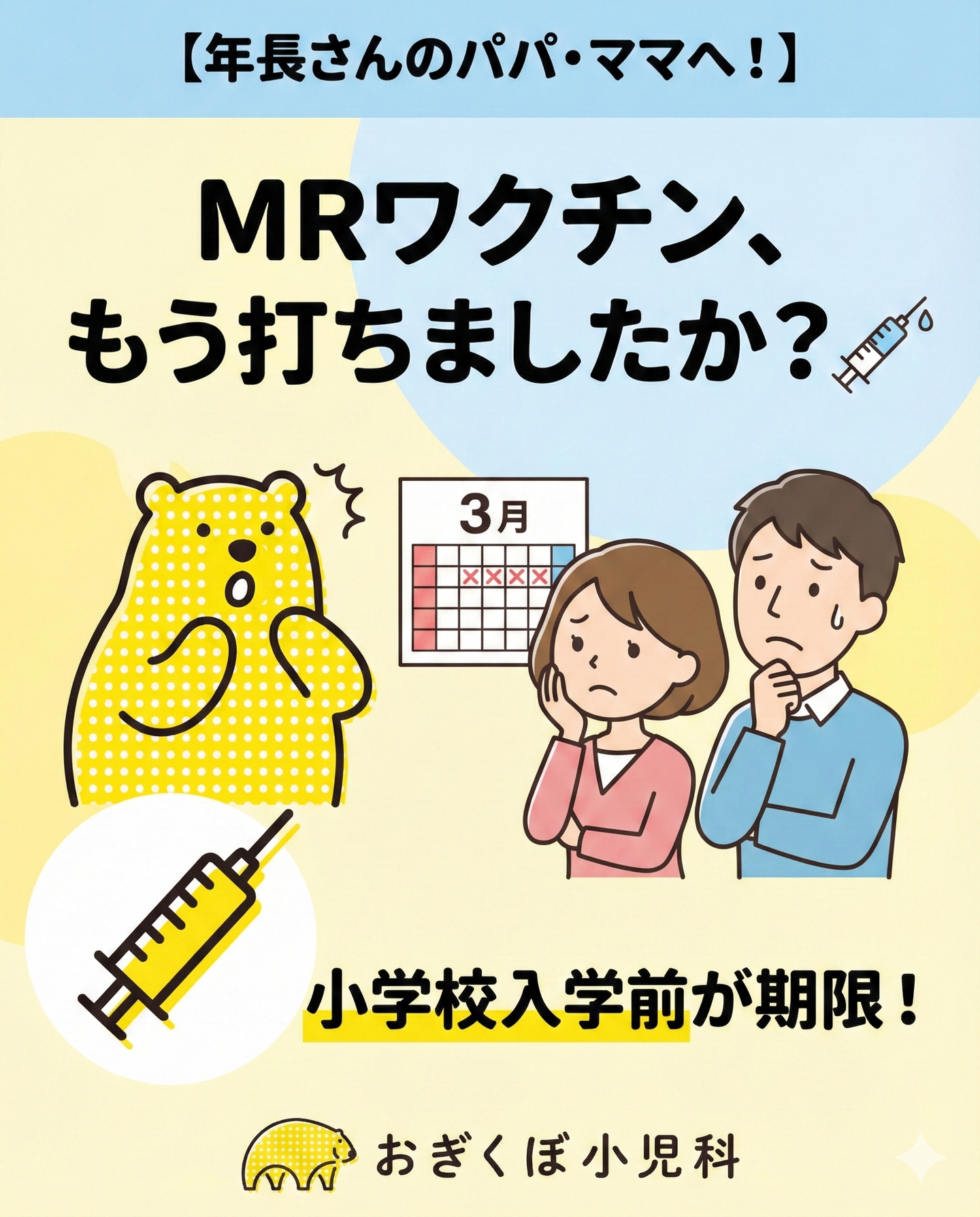 #おぎくぼ小児科 #小児科 #杉並区小児科 #杉並区 #荻窪 #MRワクチン #麻しん風しん混合ワクチン #麻疹 #風疹 #年長さん #年長 #年長ママ #年長パパ #小学校入学準備 #入学準備 #予防接種 #定期接種 #子育て情報 #子育てぐらむ #駆け込み接種