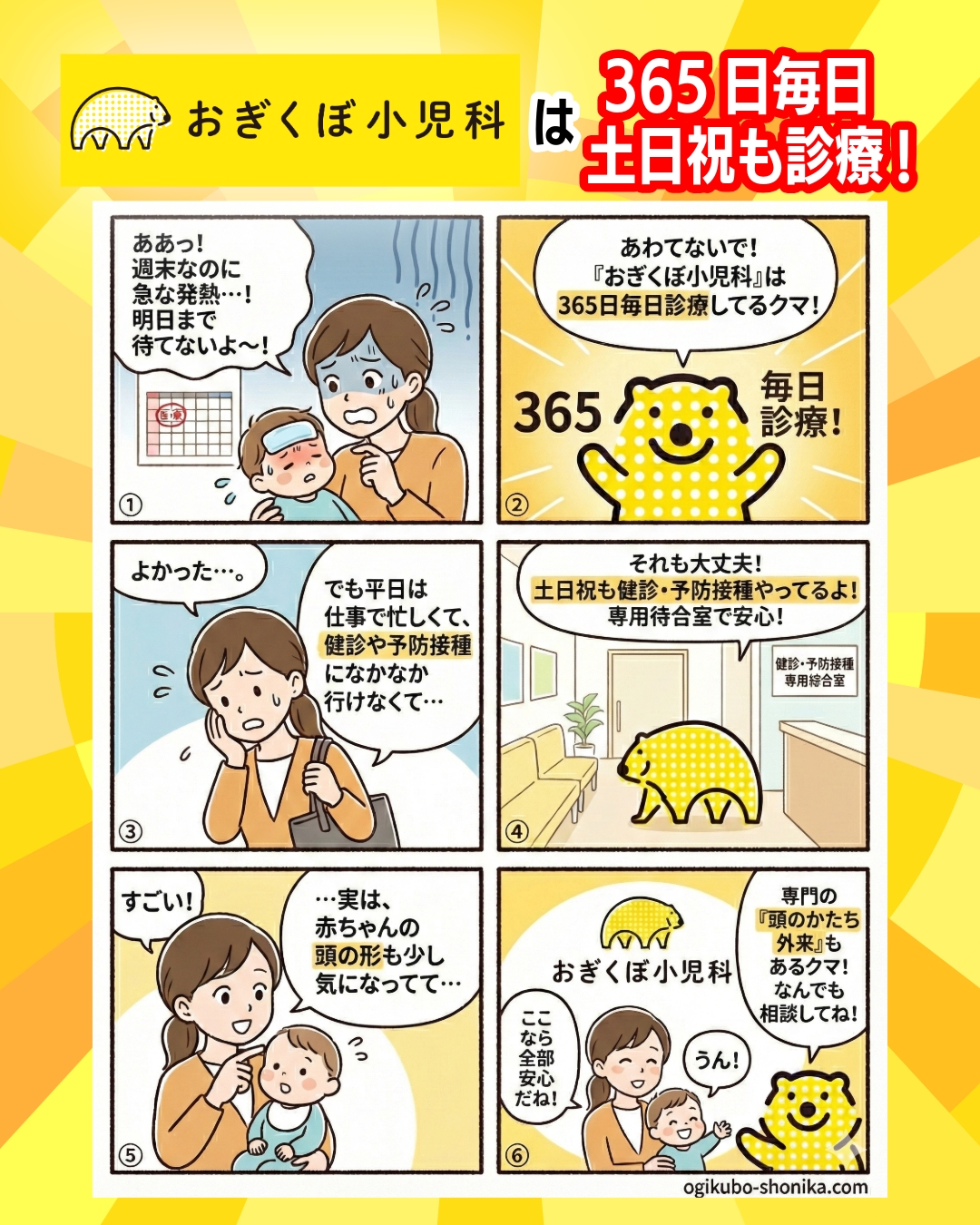 #おぎくぼ小児科 #荻窪小児科 #杉並区小児科 #小児科選び #365日診療 #土日診療 #赤ちゃんのいる生活 #子育てママ #子育てパパ #荻窪ママ #予防接種 #乳幼児健診 #頭のかたち外来 #杉並区子育て