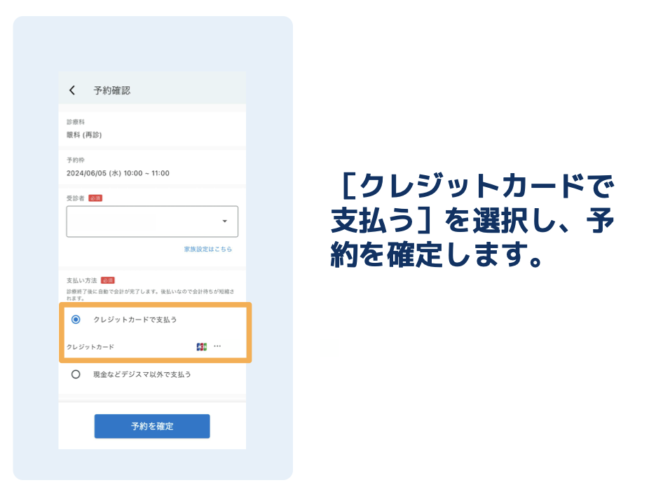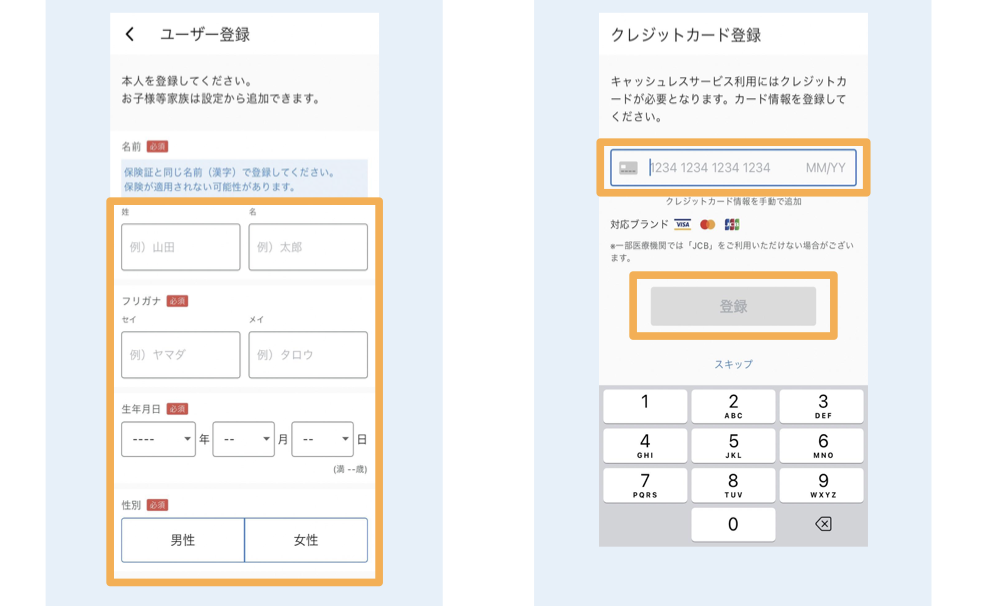 受診するお子様の氏名、生年月日、性別などを入力し、支払いに使用するクレジットカードを登録します。